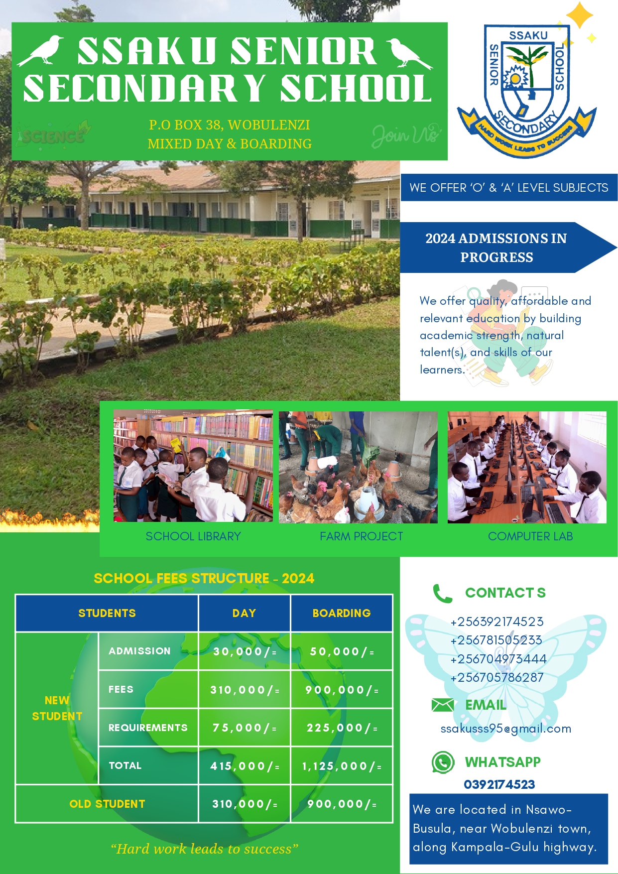 Ssaku Senior Secondary School welcomes students to join a vibrant learning community rooted in discipline, academic excellence, and practical skills. Admissions are open for Senior One (S1), Senior Five (S5), as well as mid-entry opportunities for both O'Level and A'Level.